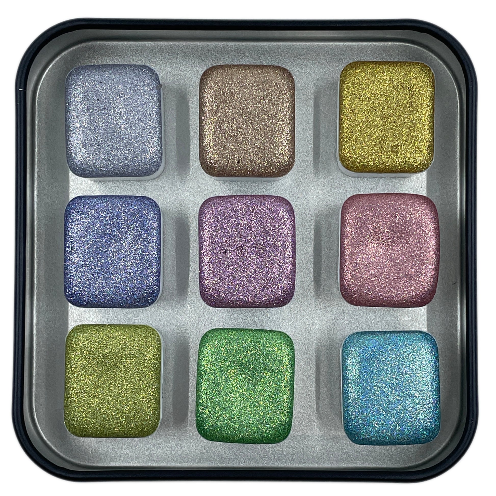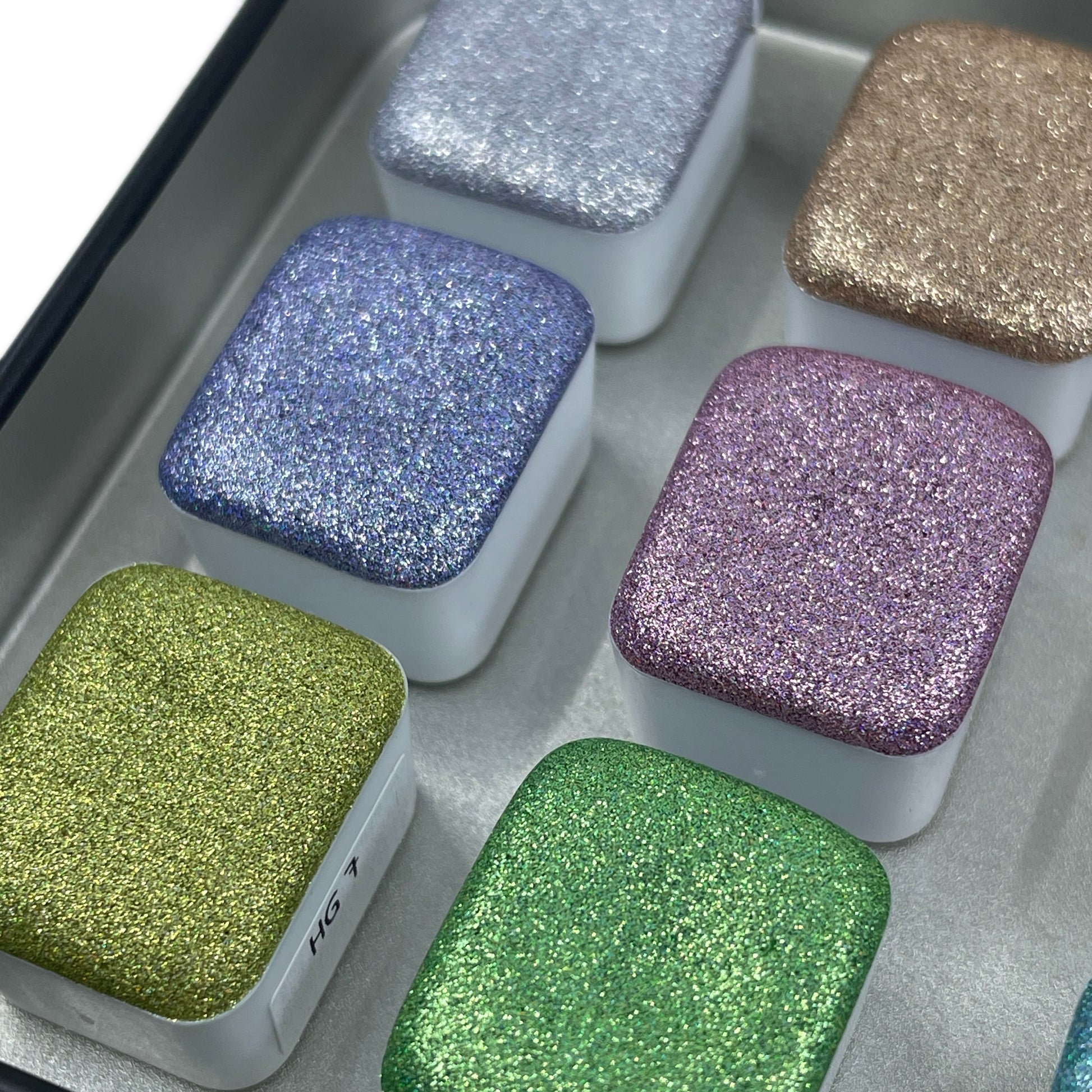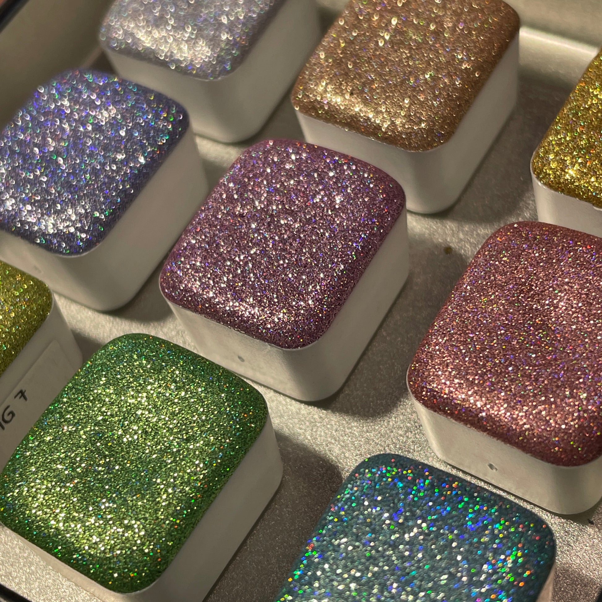 Handmade watercolor paint made with cosmetics-grade glitters.