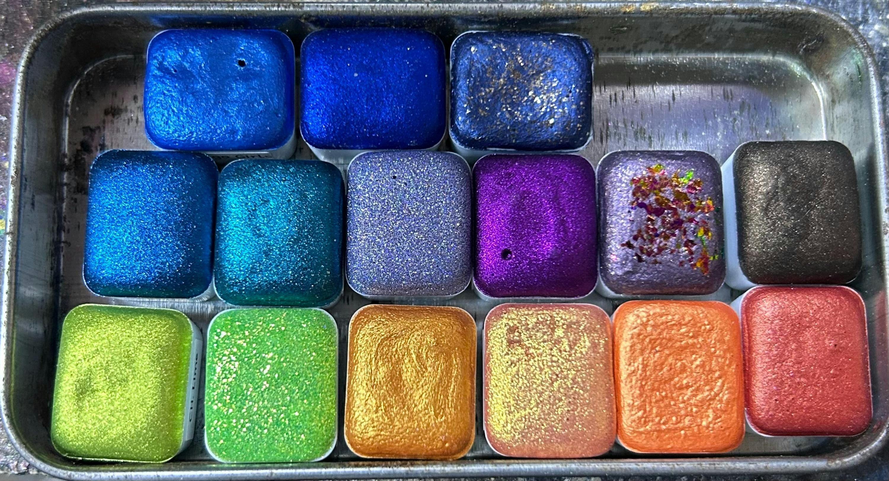 Handmade watercolor paint made with cosmetics-grade glitters.