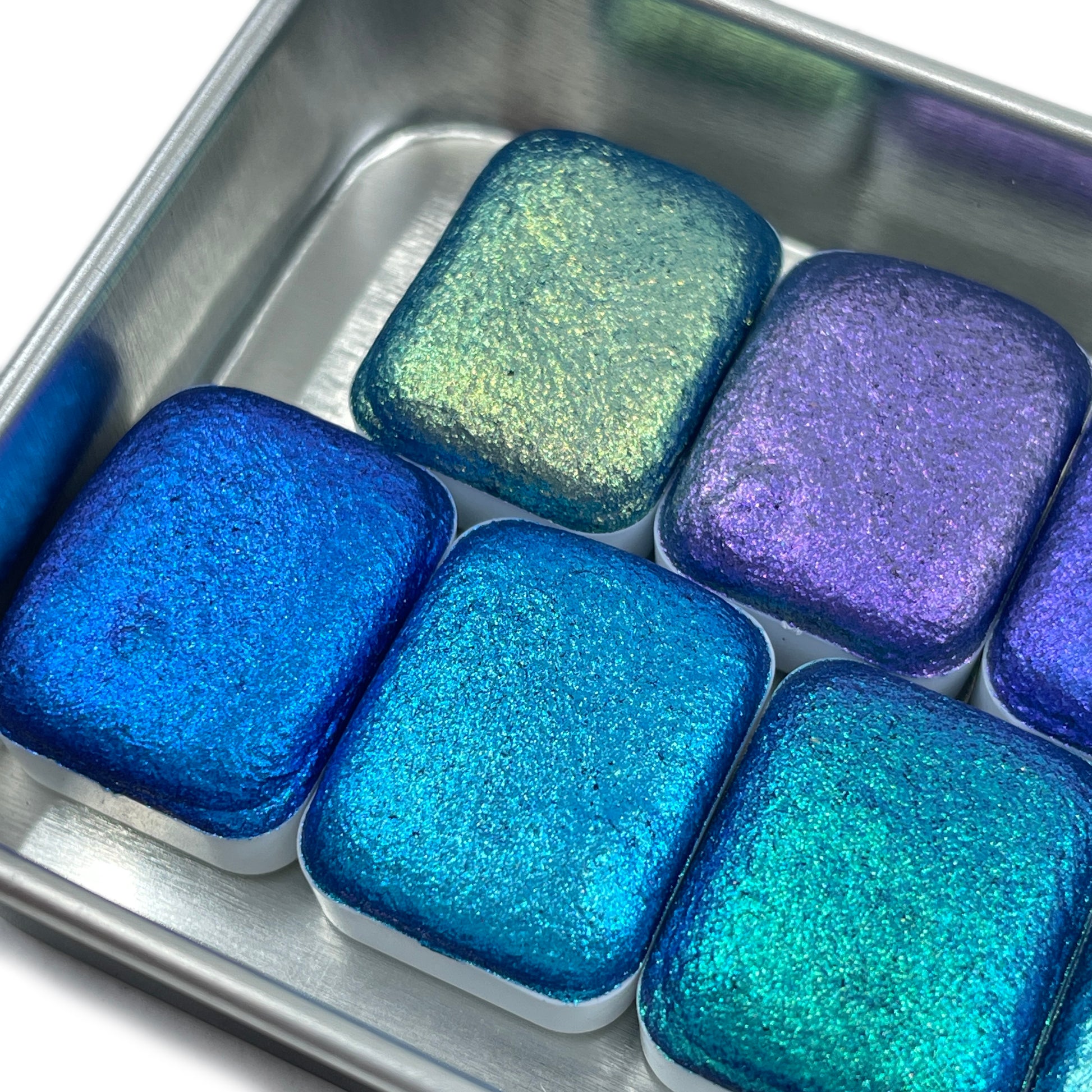 Oceans8 Quarter Pan Handmade Color Shift Aurora Shimmer Metallic Chameleon Watercolor Paints by iuilewatercolors