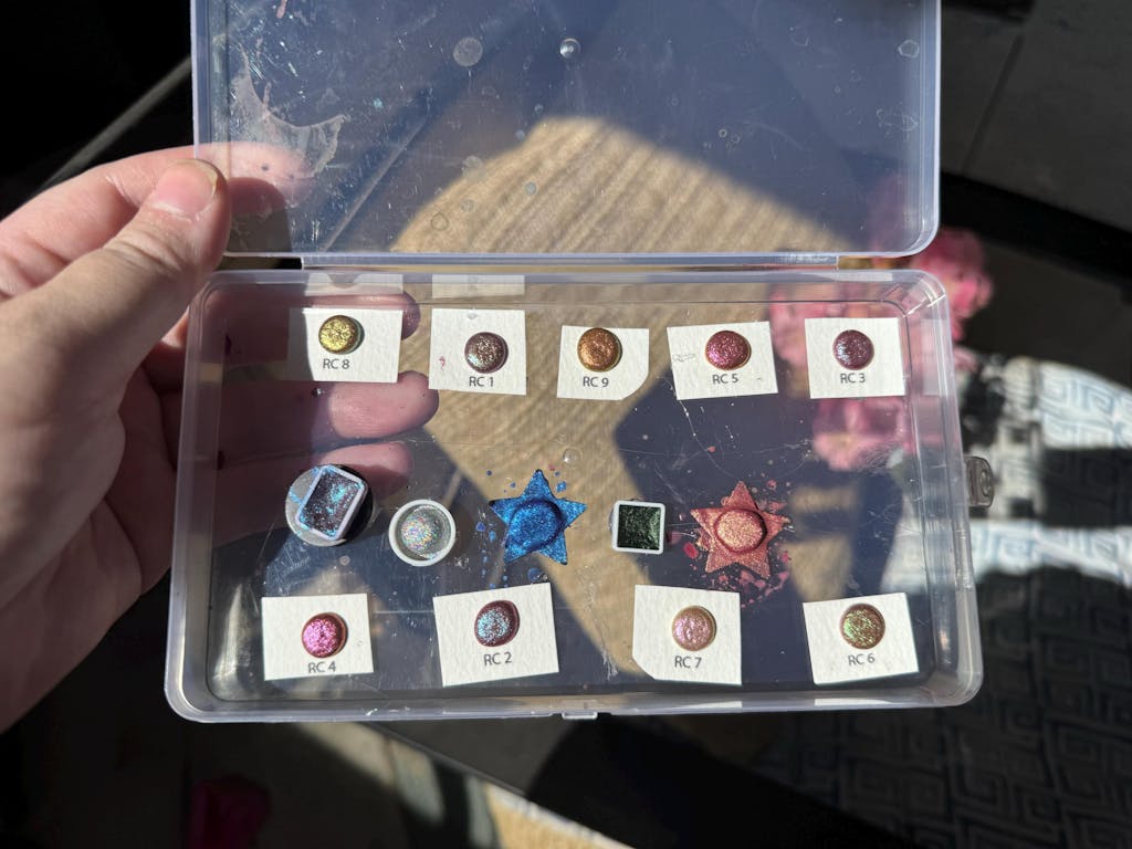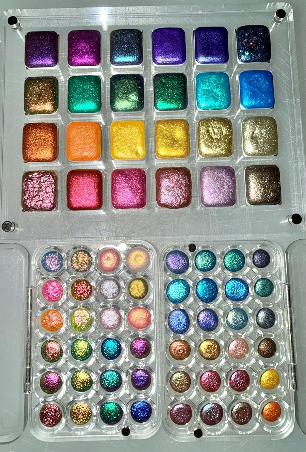 Handmade watercolor paint made with cosmetics-grade Pigments, Flakes, and glitters.
